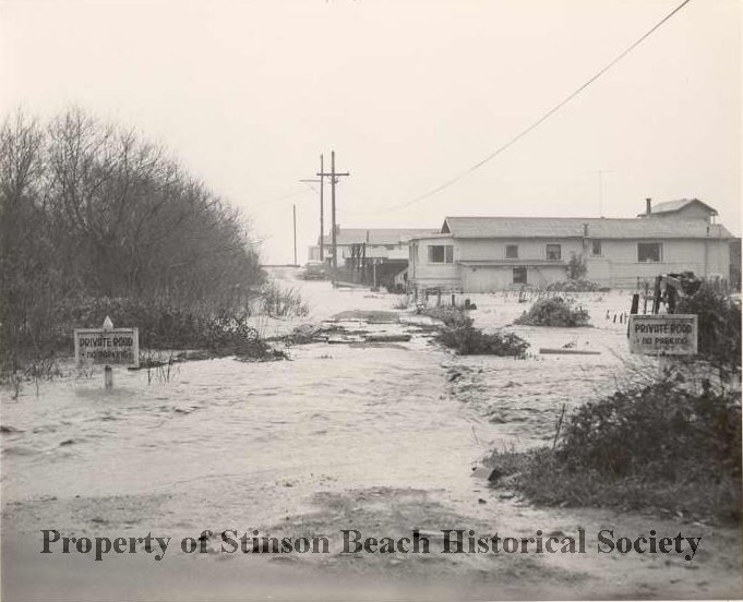 A black and white photographic print of the flood of 1956 taken of Eskoot Creek at Calle del Onda/ Hwy 1. Shows flooded bridge at the entrance of Calle del Onda and houses on North (west) side of the Calle. A bush, California Willow, to the left side of the bridge. Signs by the bridge read, "Private Road, No Parking". See 1993-222-03 notes.