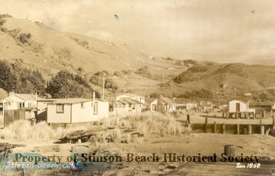 Sepia tone landscape of beach houses nestled on the far side of dune grasses and at the base of the mountain. Photo appears to be taken from Calle del Resaca facing south. One house in particular with stone chimney (at the end of Calle del Onda) has since burned down but the chimney remains. There are also wooden walkways or wind breaks visible that stretch out onto the sand. At the bottom left of the photograph is written in white Stinson Beach, Calif. On the bottom right Zan 1858.