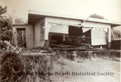 Black and white photo view of destroyed house from beach side, showing effect of undermining of the foundations, the force of water taking off the front of house. Some rattan blinds, though battered, still hang in front. Debris in front lies against the sand that is the level of the house, showing the depth of the sand removal through wave action.