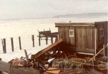 This color photograph shows an oceanfront house at Calle Del Ribera being inundated by the sea during the storm of 1982-83. The front part of the house is torn apart and piled against the house. This house belonged to Dale Kelley who originally owned this series of photographs. He was an old client of Albert Engel and entrusted the photographs to him. Al donated this series, 2010-103, to SBHS. Dale Kelley was a friend of Sellmers who had his factory and residence on the same street. The photographs were rescued from the house after the storm.