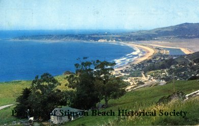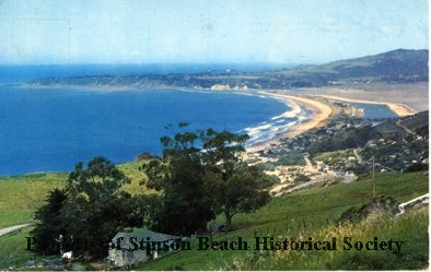 A color postcard of Stinson Beach from White Gate Ranch. Blue Sky, Blue Ocean along crescent of the beach and the Seadrift Lagoon with no houses on the Dipsea side. The Patios, Calles and houses in the Old Town and Highlands are visible. The Ranch building at the White Gate Ranch has sculptures by Bob Hudson standing on the yard. An artist couple, Bob Hudson and Cornelia Schultz Hudson, and their 2 boys, Robert Shaw, his wife, Martha, and their 2 children (boy and girl) lived and work there during 1970's. The Ranch was operated by Rick Solano and was owned by George Leonard. On the back of the card is printed: Bolinas Bay on the Marin County coast. Stinson Beach is in foreground. Bolinas lies beyond to the left. Marin Color Cards, Box 345 Inverness, Calif. 94937. Also written in pen, Peggy Pepper.