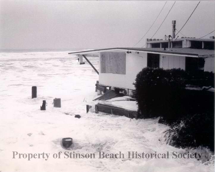 The Castle house is being inundated with water as the incoming tide rushes around it. The deck is being destroyed. The tops of several pilings are visible above the water.