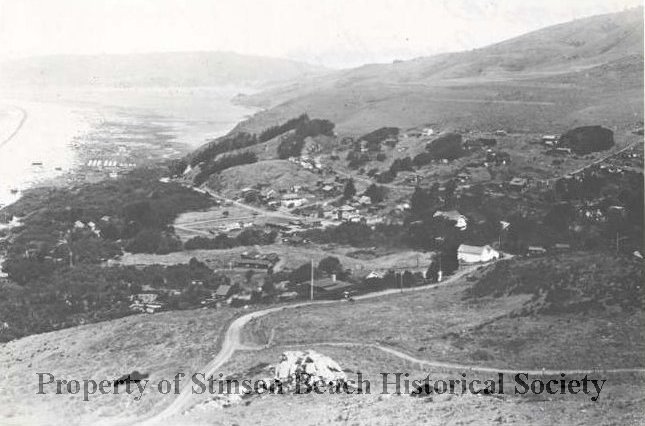 This black and white photograph is a panorama of Stinson Beach at the intersection of Hwy.1 and Dipsea Trail (now Panoramic Hwy.). In the background is the town, with Willow Camp tents on Upton Beach (now the Calles).