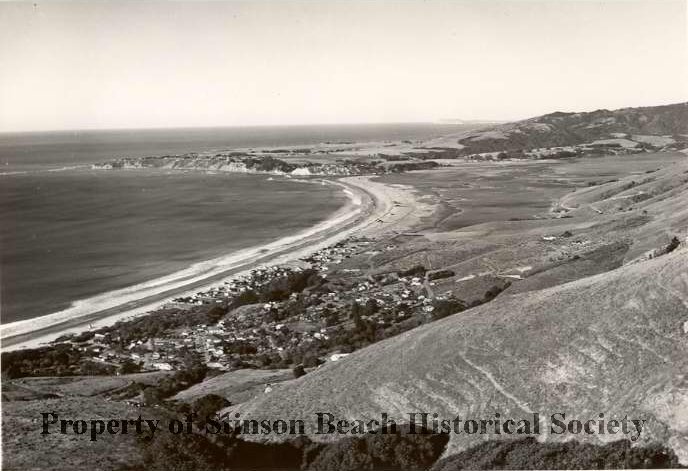 An original black and white print of a panoramic view of Stinson Beach taken 1952 from White Gate Ranch. It is essentially the same view as that in 1993-21-01, with the same features but taken from higher up, hence Pt. Reyes is more visible and the old causeway can be seen in the middle of the picture.
