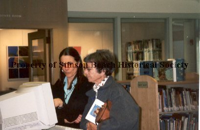 In this color photograph two women (Kerry Livingston on the left and Charlotte Irvine on the right) stand in front of a computer monitor. Kerry, in a blue bouse and black sweater, is pointing at something on the screen and Charlotte, in a print blouse and blue jacket, is watching. Charlotte has a brown purse and a book tucked under her arm. The computer monitor is an old one with a thick body. There are books on a shelf behind them the reading room is visible through clear glass windows in the background.