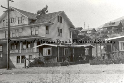 Back of photo reads: "The Stinson Beach Library occupied the ground floor of the Sea Beach Hotel in 1960." View is of a 3+ story building with a Sea Beach Hotel sign attached to the railing of a covered porch on the first floor. The ground floor beneath it has 2 tall windows and door, which could be the library, although there is a one-story L-shaped addition on the right side of the hotel, which could house the library also. There is a breezeway between it and another one-story cottage-type building with a porch to the right. Beyond the hotel is the hillside with several quite substantial sized houses.