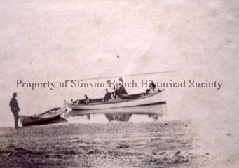 This is a photo of 2 small boats on Bolinas Lagoon with 6 unidentified people. The larger boat with 5 people sits a few yards off the sandy beach, its image reflected in the water. A man stands at the far left, holding on to the smaller boat. The larger skiff belongs to the McKinnons.