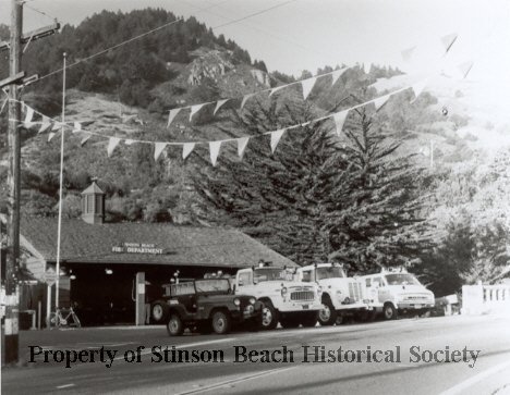 If front of the Stinson Beach Firehouse #1 are parked two fire trucks, an ambulance and jeep. Photo taken from across the road so mountain ascending behind the firehouse is visible. Also there are v-shaped flag streamers stretched over the road.