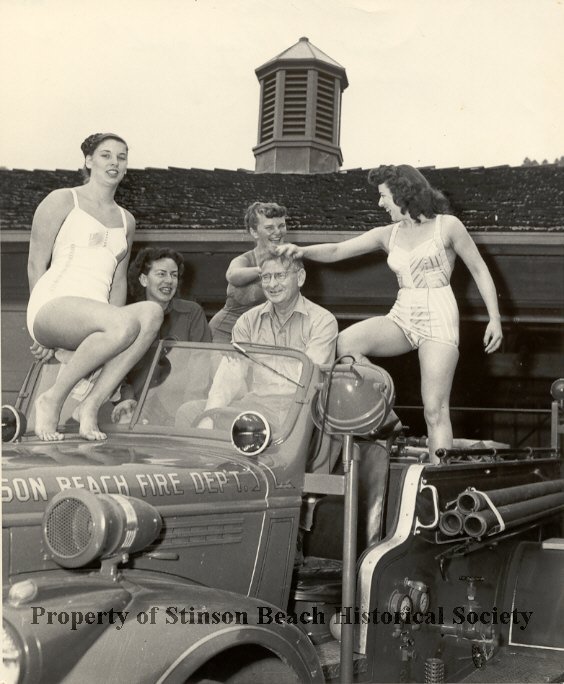 Four women and one man (Will Airey) sit on top of the Stinson Beach firetruck. The girls on the right of the picture are rumpling Will's hair and he is enjoying it. The woman on the left (Marian Upton) is perched on the windshield in a 1940's type bathing suit, the next girl has street clothes on, but the remaining two are also in swimsuits.