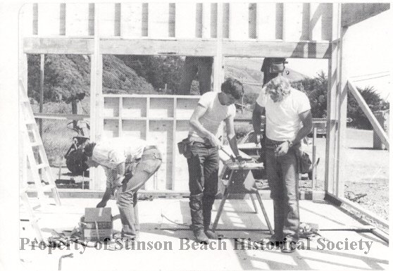 A xerox copy of a photo of the Stinson Beach Fire House #2. 3 Volunteer Firemen are working on the building. One on the left is unknown, center at a board is Kenny Stevens, who became the firechief in 2001. On the right is Bob Boyce who supervised the construction. See 2001-263-C for photographic print.