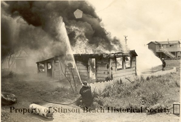 An original black and white photograph of the practice drill of Stinson Beach Volunteer Fire Department donated by then volunteer and resident, Douglas Smith. Shows a small cottage on Calle del Sierra burning and 3 firemen are subduing the fire with water. Smoke filles upper left and center of the photo. On the right 3 neighbor houses are seen. Toward the highway, under the smoke, another house can be seen. On the back of the photo: stamped "This is not a permanent print - For Reproduction Only," May 18, 1968.