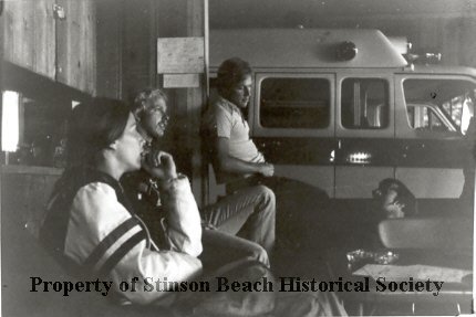 Inside the firehouse are seated in profile to the camera (L to R) are Karen Garrett, Bob Boyce and John Evans. There is a 4th person wearing glasses sitting on the floor looking up at them but he is unidentified. An ambulance is parked behind them.