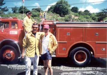 Kevin Hicks (L) and Kendrick Rand (R) stand shoulder to shoulder in front of a shiny red fire truck. Kendrick is wearing blue shorts, white shirt and yellow windbreaker. Kevin also has on a yellow FD-issue windbreaker and white chinos. Elderly man in a captain's hat stands on the fire truck behind them. Hikers/spectators can be seen coming down the hill behind them. It is the 4th of July in Bolinas.