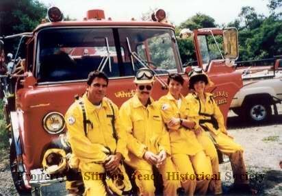 Four members of the Stinson Beach Volunteer Fire Dept. sit on the bumper of a red fire engine for a group portrait. They are all wearing their yellow rescue outfits. From left to right they are: Greg Sherfey, Mark White, Margo Roselind and Tommye Jarvis.