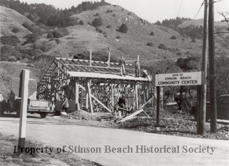 A photo of the framework of a building under construction. There are 3 workmen on the roof and 2 at ground level. To the right of the building is a sign reading 'Site of Stinson Beach Community Center'.
