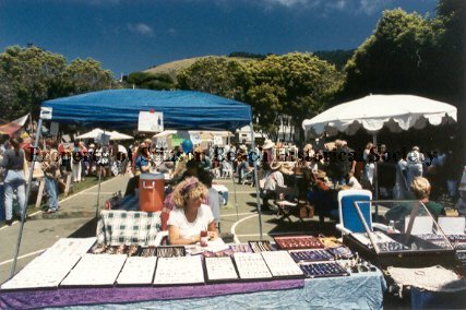 In the foreground is a blond woman in a white t-shirt sitting at a long table filled with displays of jewelry. Another open jewelry case is to the right of the table. In the background can be seen crowds of strollers inspecting the other tables set up on the basketball court of the village green.