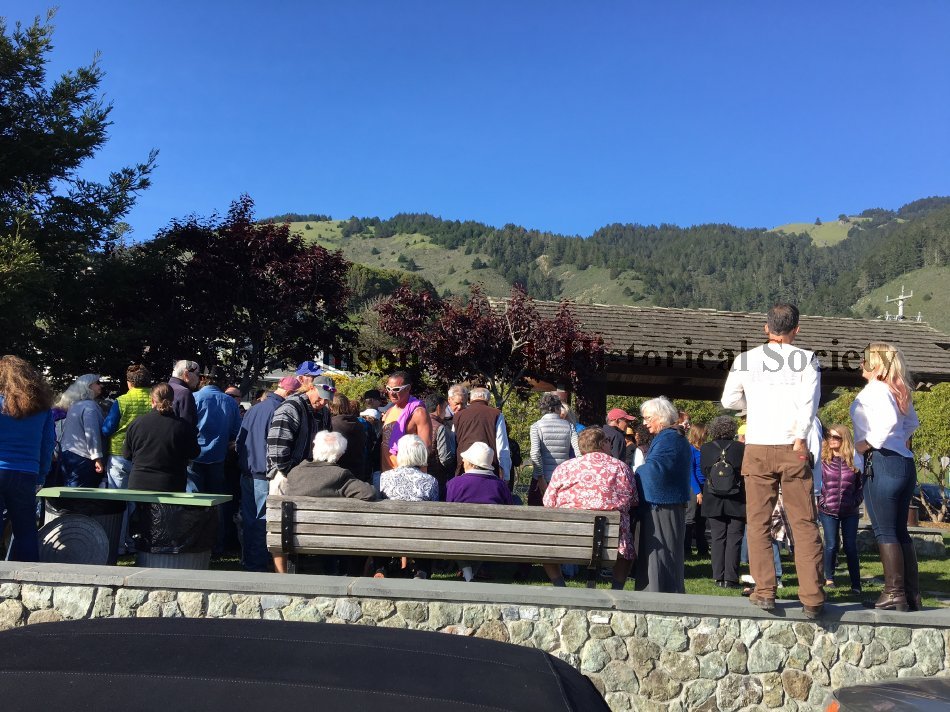 Crowd of people, mostly seen from behind, who attended the Post Office's 100th Anniversary Party at the Village Green II. Photo taken from the parking lot.