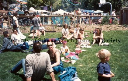 This color photo shows people sitting on a lawn. In the background behind a low fence can be seen umbrellas and display tables with people wandering amonst them.