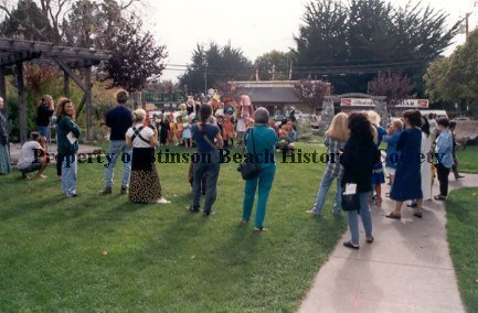 Long view of the Village Green where parents are scattered in a semicircle watching (and taking pictures of) the group of costumed children assembled at the end of the Green by the playground. Parkside is visible in the background.