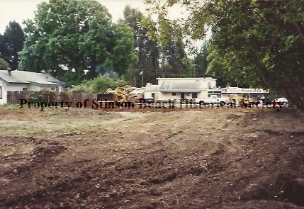This is a color photo, looking southwest, of the leveled lot soon to become Village Green I. There is a tractor at the far end of the lot the Parkside Cafe can be seen across the street.