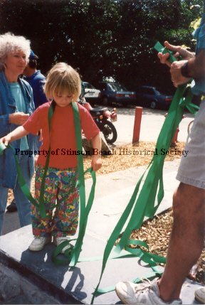 The same child as in the previous photo stands with the green ribbon draped over his shoulders looking down at the ground. The partially visible male is holding one end of the ribbon, a white haired woman in blue is standing behind the child looking on.