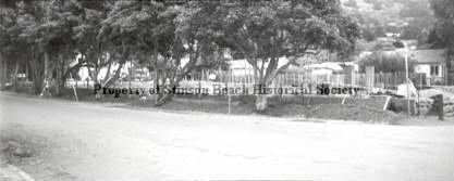 Corner site of Village Green and beginning of construction. There are trees lining the site where mounds of dirt are visible, fenced off from the building beyond.