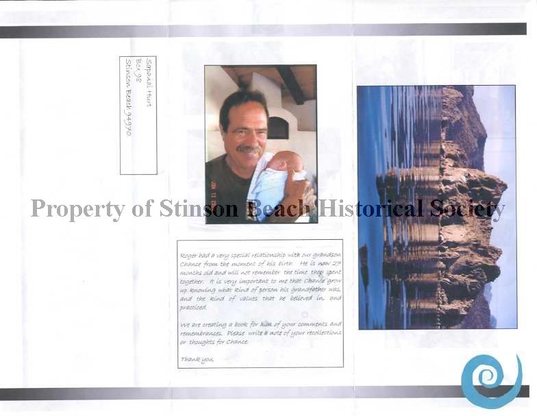 A tri-folded 81/2x11 color printed mailer announcing the memorial gathering, September 10, 2006, for Roger Hurt who died in Mexico while scuba diving. Roger Hurt was (and at the time of his untimely death) a long time chairperson of the Stinson Beach Village Association. The announcement shows 7 in front and 2 photographs of him working and traveling in Nicaragua, Mexico, and in Stinson Beach. The back photograph shows him holding the new born grandson,Chance, and the text asks for recollections and thoughts of Roger from the receivers of this announcement to be made into a book for Chance. See 2009-100-02, 03.