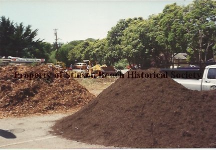 In this color photo we see a pile of topsoil and a pile of mulch both destined for the plant beds in the Village Green I. There are a white pickup truck. a tractor and the Roof of the Parkside Cafe visible behind the mounds.