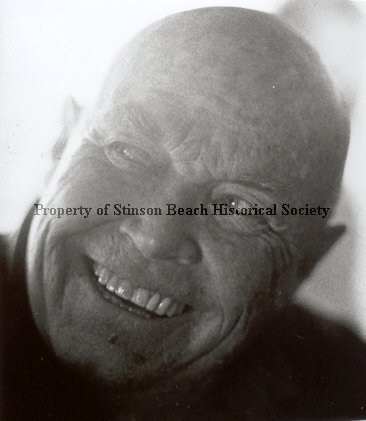Portrait of a smiling, bald, twinkle-in-the-eye Col. George White, casting his eyes off to the side. He was the fire chief of Stinson Beach 1960s and early 1970s when Kendrick Rand took over the job. He lived on the ocean front of Calle dell Embarcadero with his wife, Albertine.