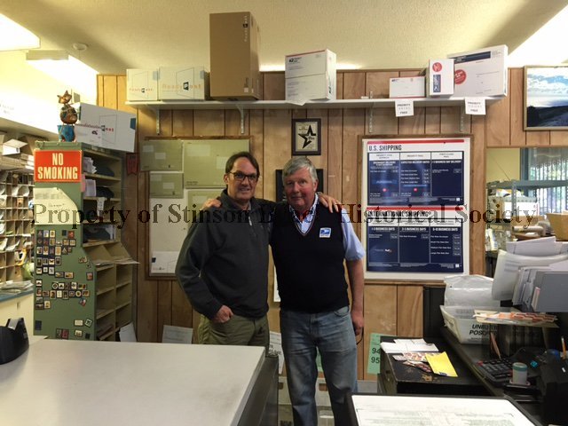 Postmaster James Harvey stands beside longtime Postal Clerk Mark White. They are inside the Stinson Beach Post Office and each has an arm around the other's shoulder.
