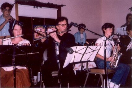 A color print from a slide in our collection of the Tuesday Night Band rehearsing for the Firemen's Ball in 1984. From the left: Agnoli, Vasco/Crandall, Harriet/Agnoli, Valentino/Abbott, Nick/Crandall, John. The Tuesday Night Band was created by David Murray who was the musical instruments teacher at Bolinas Stinson School and the director and conductor of the West Marin Community Chorus and Orchestra in 1980. It consisted of the students, parents and other interested adults. It practiced on Tuesday nights. It was disbanded when David and his wife Susan moved to San Diego in 1986. It performed at local fairs and holidays.