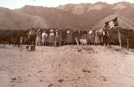The scene shows a group of 14 men and women standing in a row and facing the camera. Behind them are tree covered mountains and before them a large expanse of sand. At the right of the picture and just in front of the people is a flag pole stuck in the sand, showing a white skull and crossbones on a black background. The clothing appears to be from the early 1900's.