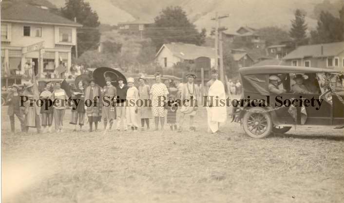 A line of people of all ages and in varied array (from togas to polka dot dresses to ladies holding black umbrellas and one with a black flag) stand behind a vintage automobile. Everyone is facing the camera, including the two gentlemen in the front and back seat of the auto. They are in an open area across from Airey's Store. Other houses rising on the hillside are visible behind them. They are either part of the parade about to take place or waiting observers. On the back of the photo is written in pen: 4 from the left, Hattie Miller? 4 from the right Ruth Miller, far right "Pop" Stelling.