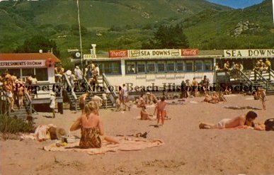 A colored postcard of Sea Downs, a popular establishment on the beach. Photo was taken around 1950. Shows the beachfront side of Sea Downs (a long, low building with windows across the entire front) with many people going up to and out of the establishment via the front two stairs and passing time on the deck. Groups of people are sun-bathing in front on the sand. There are green hills in the background showing houses on Panoramic Hwy and the highway near the junction of Hwy One. The signs on Sea Downs read from the left: Refreshments/ Ice Cream/ Office/ Coca Cola/ Beach Cabins, Sea Downs, Dining Room/ Coca Cola/ Sea Downs.