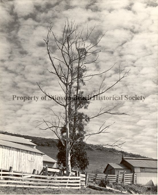 In the center of the picture is a tall dead tree with many bare branches. Just behind it is another tall tree, this one live with many foliaged branches. In front of the trees along the bottom of the picture is a low plank fence surrounding several ranch buildings or sheds. Two buildings are at the left beside the trees and farther off to the right is another buildiing.