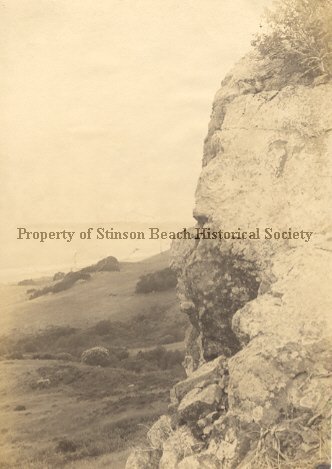An Original print. Distance photo of Belvedere Ranch, later Stinson Ranch, near Stinson Beach School by Edgar A. Cohen. A rock in foreground, Bolinas Bay and Mesa in background. On its back: Photograph (stamped)#1820 Belvedere Ranch (penciled) Edgar A. Cohen, Alameda, Cal.(stamped) The Bolinas Beauty (penciled)