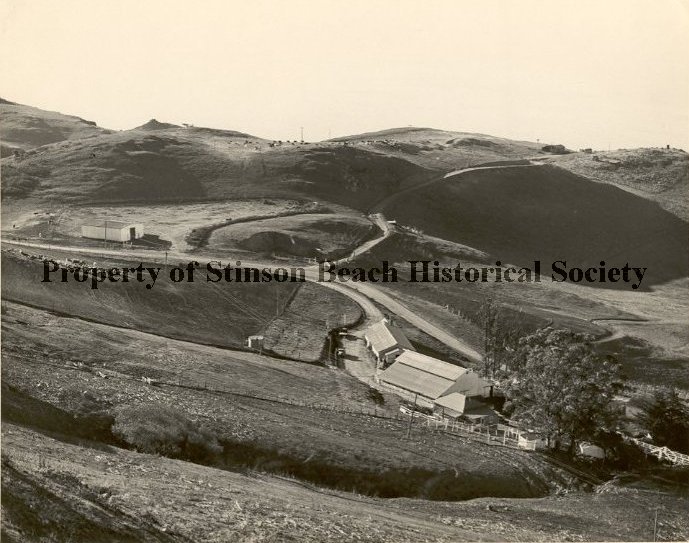 Panoramic view of the White Gate Ranch house and barn taken from the hill above the north of the Ranch. The house, two larger barns and the eucalyptus trees which still stand today are on the right front, Panoramic Highway crosses diagonally on the photograph. A wide ranch road from the house crosses the highway to join present-day Dipsea trail. In the middle left of the print another smaller ranch building stands, the electrical line connecting it to the house. In the upper left is the present-day fire road which leads to an old Bunker site of World War ll and part of present Dipsea Trail. Cows are grazing on the far hills toward ocean. Dated in ink 11-7-48 on the back.