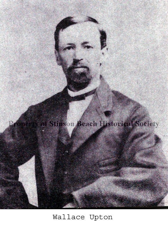 This is a digital photograph taken from page 139 of the book written by Jack Mason in 1973, Last Stage for Bolinas. The caption reads; "James Wallace Upton, Archie's father, was a partner in the Stinson Beach purchase (with Nathan Stinson). He died in 1873. Mr. and Mrs Earl Skinner Sr. Collection". The photograph shows a youngish man with a short hair and a short beard. He is wearing a buttoned vest over a white high collared shirt with a thin bow tie under his large outer coat. Only his upper body is showing with his right arm possibly resting on his waist and his left arm on a table top.