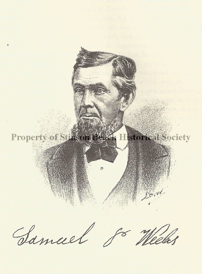 This is a photograph of a drawing of Samuel P. Weeks who owned the Weeks Ranch, last known as the Audubon Volunteer Canyon. Weeks a captain of "Eliza", Bolinas-San Francisco cargo ship, bought 150 acre ranch from Briones of Rancho Bolinas in 1865. In this portrait he is a youngish gentleman with short hair and smallish beard. he is wearing formal attire with a bow tie. The photograph was taken from J.P.Monro-Fraser, History of Marin County, published on 1880.