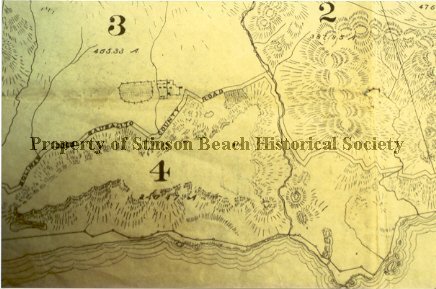 A photographic copy of a map of Throckmorton Ranch, Tam Land and Water Company, located on Bolinas-Sausalito County Road, known as "Outside Road" to locals. The ranch appears to be located between the Rocky Point and the south end of Stinson Beach along the road, now the Highway One. The Steep Ravine Creek runs through it. It indicates some development on the both sides of the road.