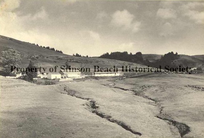 This original black and white photographic print is taken from the ocean side of Panoramaic hightway looking across to the ranch. The foreground is grassland with two eroded gullies running toward the camera. Behind the line of Panoramic Highway are the ranch buildings. There is a long, low barn on the right and a taller barn to the left of it. To the left of the barns are smaller buildings, some among the trees. All the buildings are painted white. The hillside rises behind the buildings.