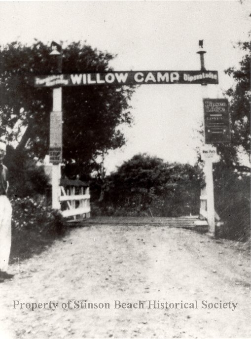 The photograph shows a road leading up to a gateway before a wood plank bridge. Over the gateway is a sign saying WILLOW CAMP and in smaller letters on the right Dipsea Lodge and on the left Furnished Cottages. At the left side of the photo is the cut off figure of a man. (see notes)