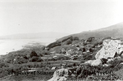 This black and white photograph is a panoramic view of the town of Stinson Beach. In the right foreground are some large boulders beyond which are houses on the hillside above Bolinas Bay. Beyond the coastal hills can be seen the sand spit extending towards the dimly seen Bolinas Ridge. The latter is extremely hazy. A row of white tents can be seen in the left middle ground at the beginning of the sand spit.