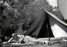 A man in a sleeveless shirt, trousers, white shoes and brimmed hat lies on his side with his head resting on his hand reading a book in front of a tent. The tent is set up beside some tall bushes or bushy willow trees. The tent flaps are open.