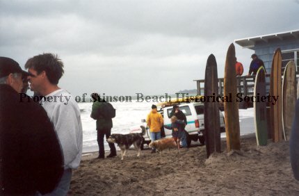 Surfboards at attention. A lifeguard jeep is parked in front of them, also carrying a surfboard on its roof. A few people are beside it as well as a couple dogs. On the left edge of photo a few people are huddled in conversation.