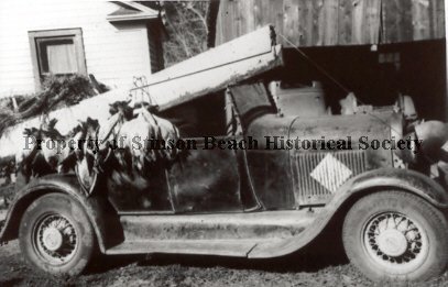 This black and white photograph is of an open Model T automobile. It is a side view and the vehicle is parked in front of some buildings. There is what appears to be a long roll of carpeting on top of the car slanting from on top of the windshield back to the back of the car and protruding farther than the back of the car. Bundles of dead ducks, tied at the neck, are hanging from the cylinder onto the side of the car.