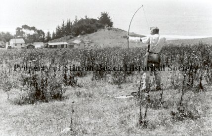 In a weedy hillside field overlooking the ocean, and a short distance from a grassy knoll with 3 or 4 structures at its base, a man (with back to camera) stands with a large bow pulled back and aiming at something in the distance. He wears additional arrows in a quiver at waist level.