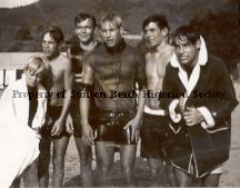 Boys are from the left; Africa, Kit/ Greene, Roger/ Stewart, Craig/ Ferris, Kirby/ Gira, Bernie/ Ferris, Rudi. The photograph was given to the donor, ex-wife of Kirby Ferris, by his father Melton. Kirby Ferris started the town surf shop, Live Water in early 1970's at the Staples Building on Hwy 1. The shop was moved to the Avilla's Barn in 1980. The donor, Millicent Mead, took over the shop in 2001. Rudi Ferris, his younger brother, became the local plumber and known surf fisher. On the back of photo is written in pen: (2) Melton Ferris 460 Meva Albion; Kit Africa-Roger Green- Craig Stewart- Kirby Ferris-Bernie Gira, Rudi Ferris. The front of the photo has crop marks by ball point pen.(ta)