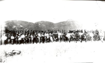 Members of the Contra Costa Hill Hiking Club stand single file, stretched out along the landscape. Most are standing with one hand on the shoulder of the person in front of them, a few had one leg extended in the air. On the back of the original photo is written "Lone Tree," a trail on Mt. Tamalpais.