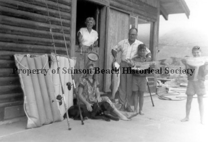 In this black and white photograph the whole family poses beside their house. A girl (Jan) in a print dress and long blonde hair sits on the ground with a black lab beside her. Behind her, looking out of the top half of a Dutch door is a woman (Adelaide) with short blonde hair and wearing a white blouse. She is smiling and holding a skillet and a spatula. To the right a man ("Sundown" Roland) stands with his hand on the shoulder of a boy (Mark) who stands in front of him. He holds a big fish (striped bass) in his other hand and the boy is holding a big fish horizontally in his arms. At the right side of the photo there is another boy (Craig) holding yet another fish horizontally up by his chin. There are two rubber rafts and two fishing poles leaning against the house.